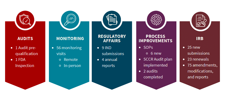 SCCR is committed to conducting and supporting high-quality, compliant clinical research. We employ a Quality by Design strategy, underpinned by a specialized team with vast experience in Quality and Compliance. This team’s expertise is instrumental in supporting all SCCR clinical research activities, enhancing safety and well-being of participants, and integrity of the research.